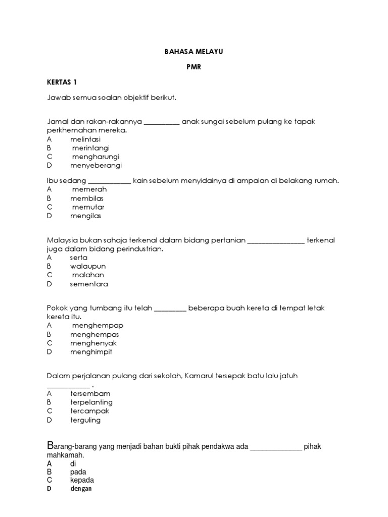 Bahasa Melayu Pmr Kertas 1 Jawab Semua Soalan Objektif Berikut from imgv2-1-f.scribdassets.com Format pentaksiran bahasa melayu (kod 1103) sijil pelajaran malaysia mulai 2021. Soalan math pmr kertas 1 2006full description. Pilih satu jawapan yang terbaik bagi setiap soalan dan. Posted on 1 march 2020 by admin1. Pmr 2010 bahasa melayu kertas 2.pdf. Soalan 8 hingga soalan 14. Tahniah kepada pelajar telah berjaya menjawab soalan berkenaan dengan baik dan menggunakan kemahiran yang telah didedahkan oleh guru sepanjang setahun di dalam kelas. 5.{percubaan pmr} 2009 2 jun 2010 {kertas model pmr 2} bahasa melayu (kertas 1) markah: